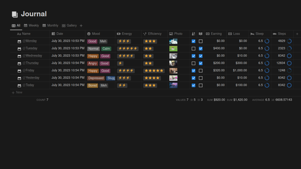 Journaling & Habit Tracker template with 4 views (All, Weekly, Monthly and Gallery).